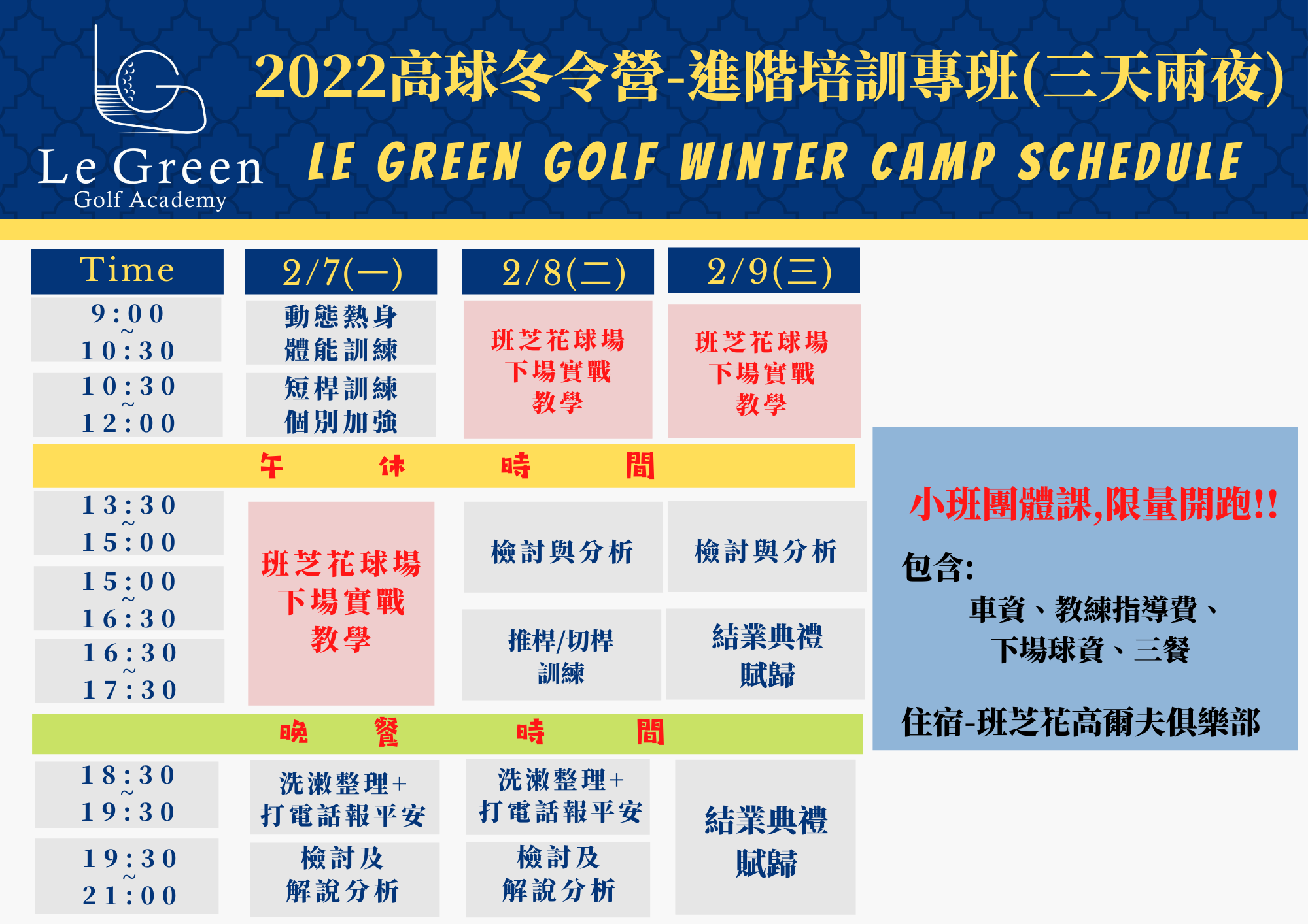 冬令營|小班制團體課程|兒童才藝 [樂果嶺高球學院]x 2022冬令營進階異地訓練營! 輕鬆FUN寒假 X Le Green winter Camp 寒假期間開學前與小白球來場美麗的邂逅吧 今年異地訓練營安排三天兩夜的課程, 等著孩子們來一探究竟~ 課程安排豐富,訓練扎實 讓寶貝們能更進一步的成長喔~ 招生對象 👇🏻👇🏻 ✅ 5-12歲之兒童 ✅過去有上過一對一課程之兒童 ✅小班制團體課程 ✅ 遠離3C,保護眼睛 👀 課程資訊+報名請洽 LINE:@odp0694z 點我加入 專人為您服務 課程內容